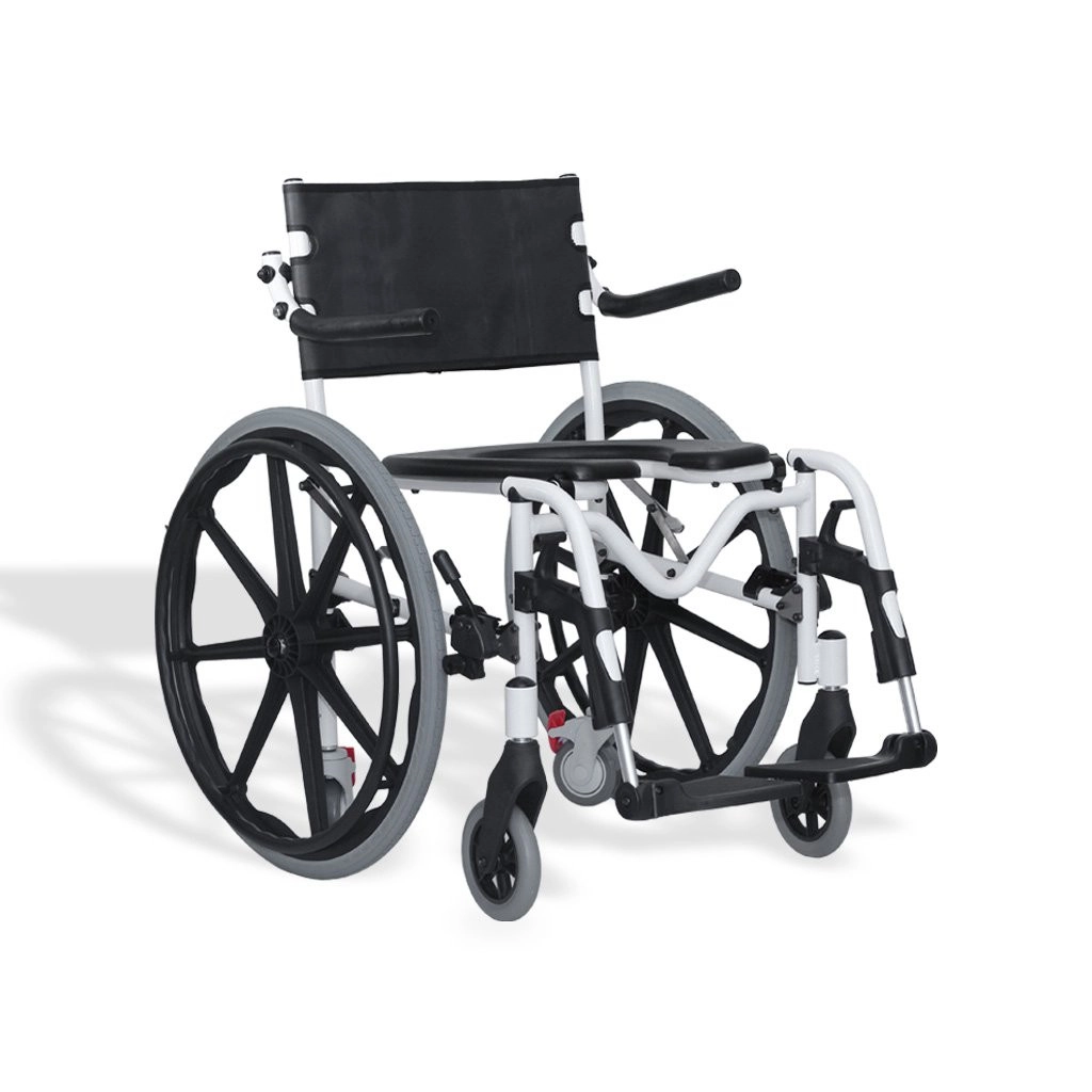 A H1 é a cadeira de banho mais completa e versátil. Com 4 rodas pequenas de série que podem ser usadas para passar em portas mais estreitas, ou colocando as rodas grandes para auto-propulsão.